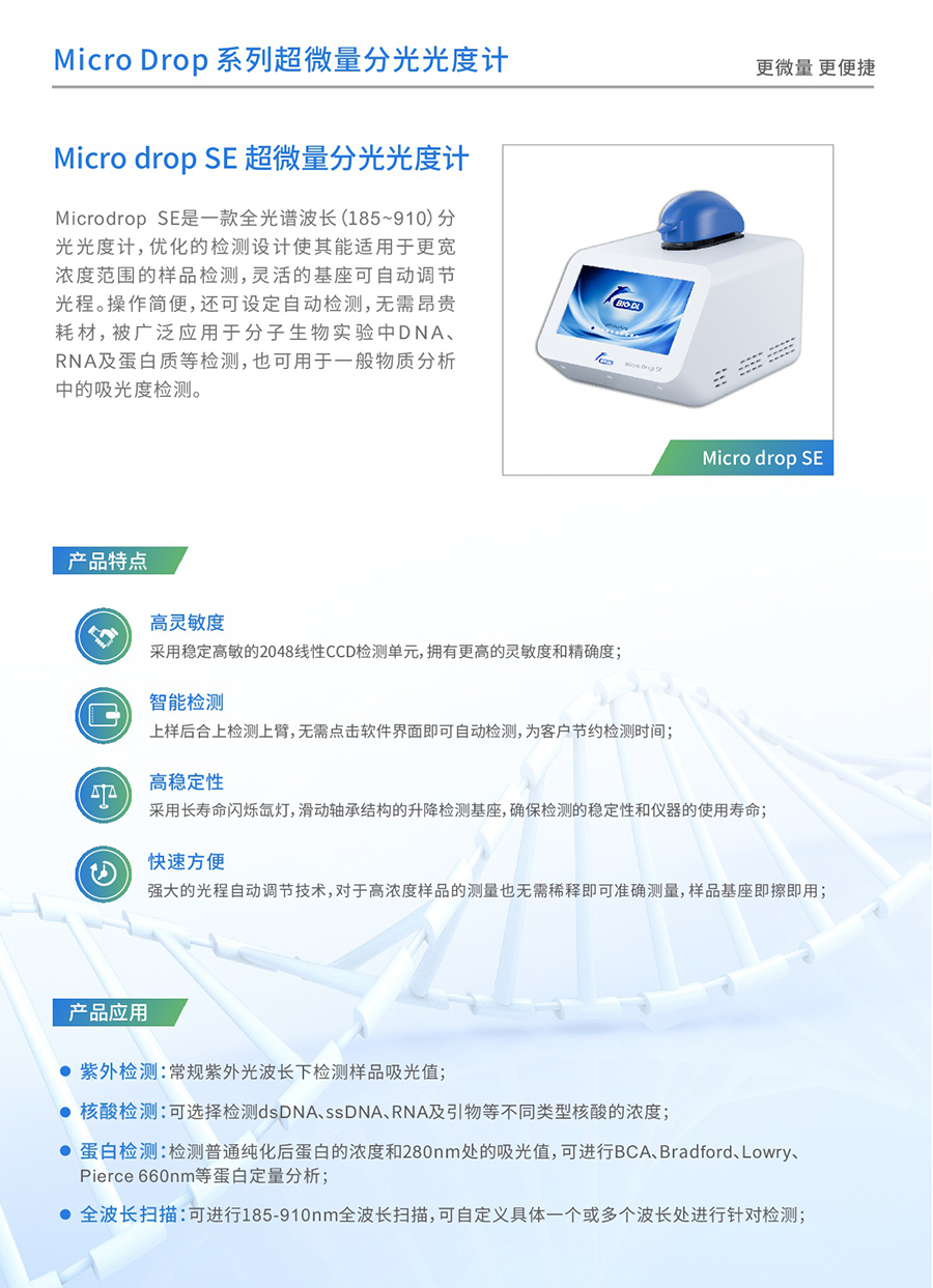 Microdrop plus超微量分光光度計是寶予德Microdrop的升級款,體積小巧,方便放置于各種空間能快速準確地檢測微量(0.5-2uL)樣品中目標物質(zhì)的吸光值,波長(cháng)掃描范圍廣,通過(guò)其寬闊的觸摸屏可以輕松簡(jiǎn)單地進(jìn)行操作。它具有多種檢測模式,能夠輕松應對不同檢測實(shí)驗室中對樣本中DNA/RNA/蛋白質(zhì)等生物分子物質(zhì)的吸光度檢測。