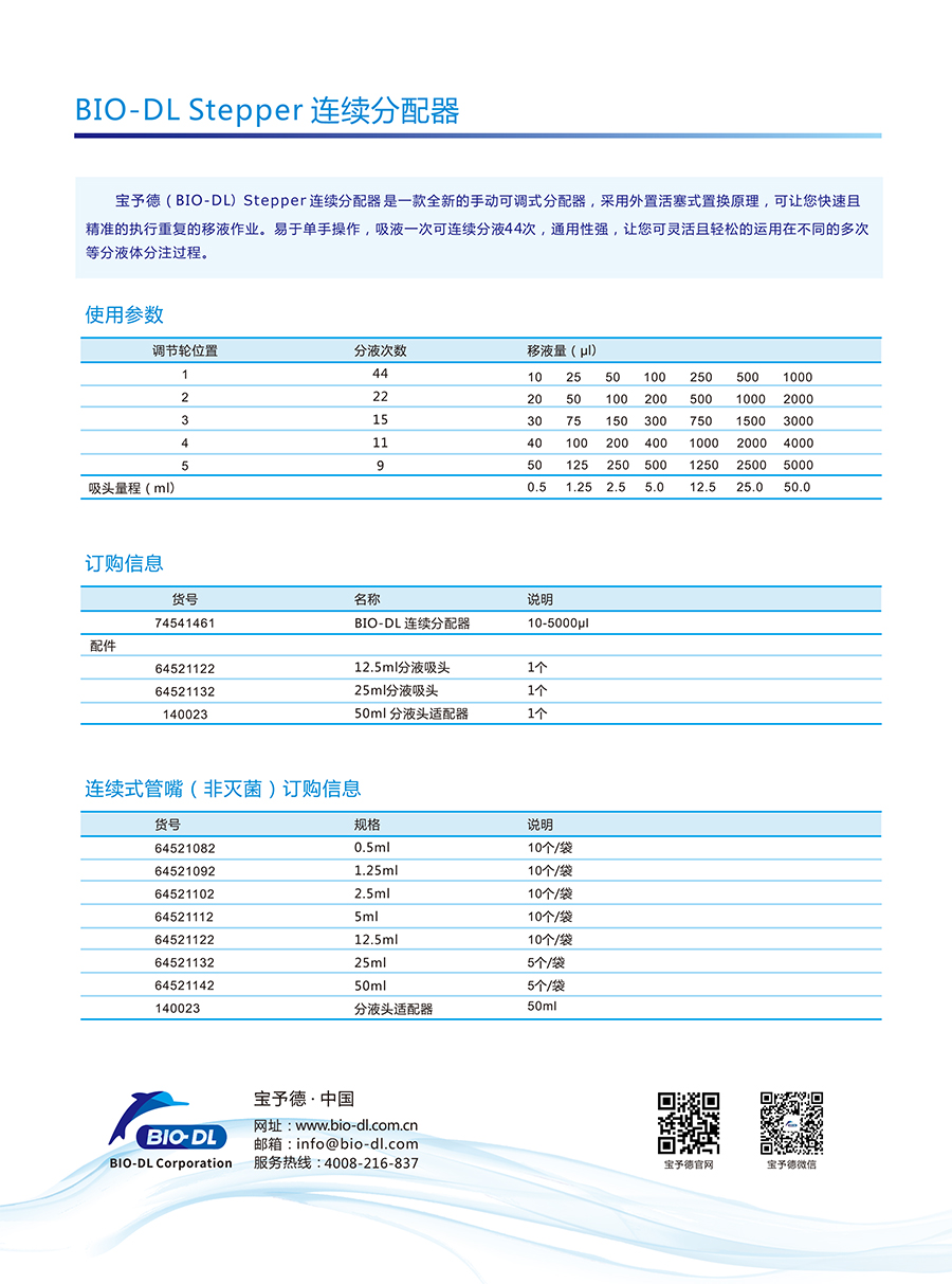 Stepper連續分配器是一款全新的手動(dòng)可調式連續分配器,采用外置活塞置換原理,可讓您快速且精確的執行重復的移液作業(yè)。